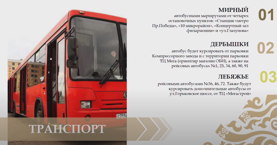 Также будут курсировать автобусы №№23 и 56. Кроем того, на Сабантуй в Мирном можно будет приехать электропоездом со станции «Казань-1».