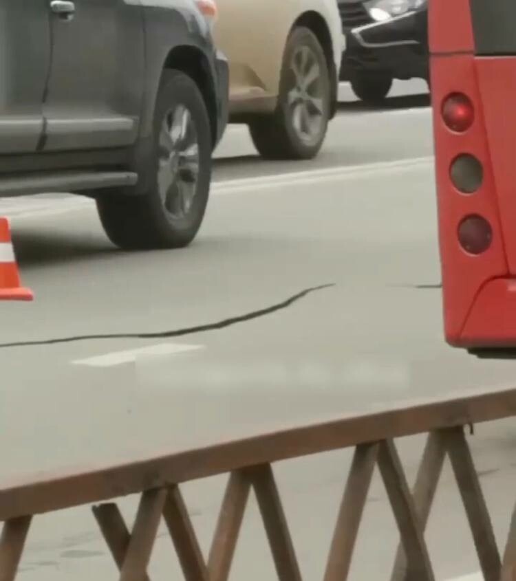 На кадрах видео видно, что на асфальте появился огромный разлом.