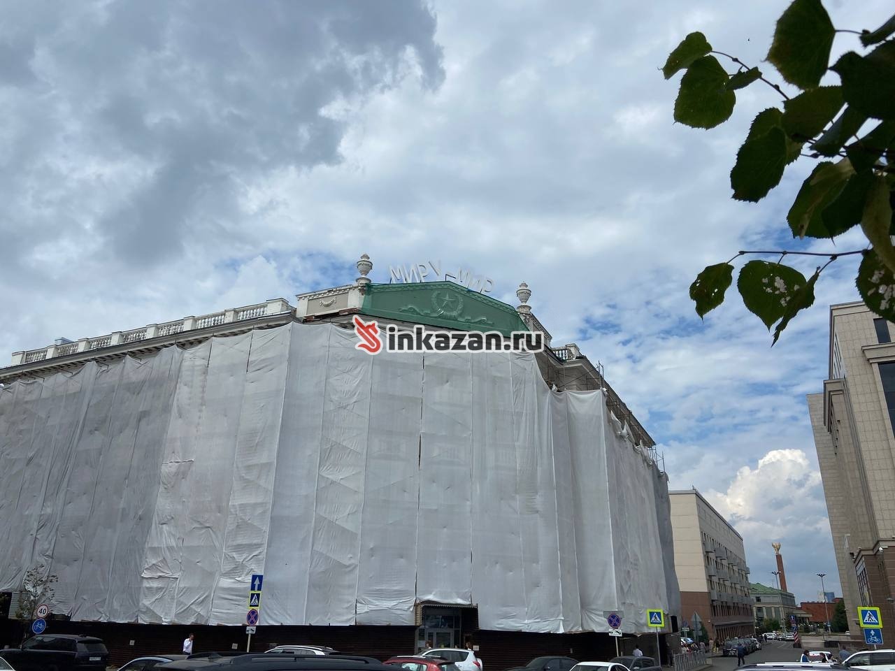Само здание огорожено белым «полотном», виднеется лишь знаменитая надпись «Миру — мир» на его крыше. Фото: inkazan.ruНа доме находится 182 декоративных бетонных элемента. В марте этого года один из них упал на пешеходный тротуар. Никто не пострадал, но после инцидента специалисты провели обследование. Оно показало, что лепнина находится в неудовлетворительном состоянии.