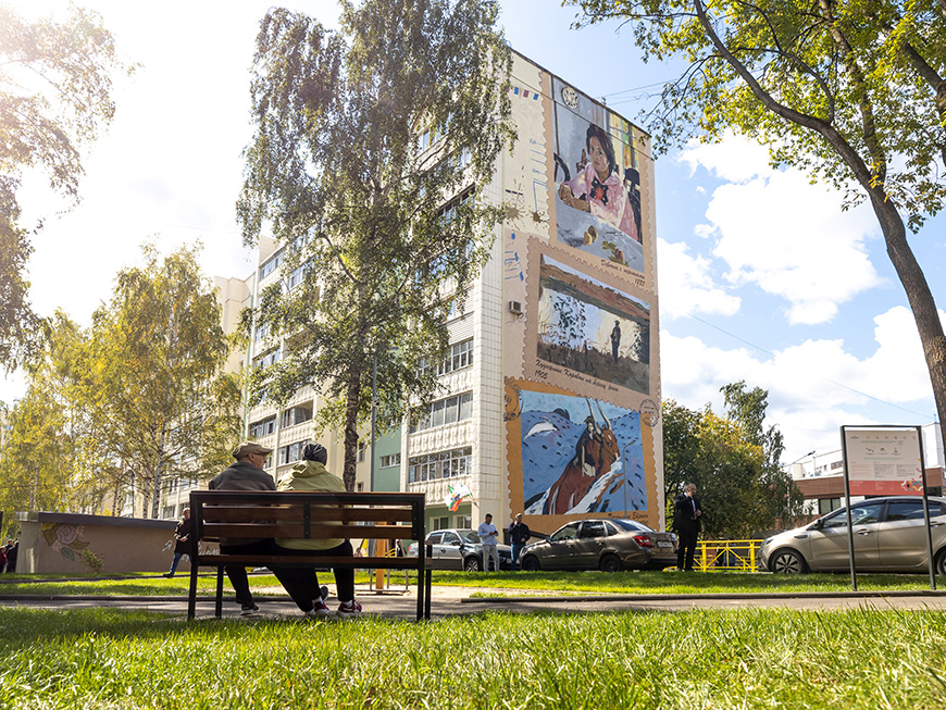 Внимание во дворе привлекает и мурал, который появился на фасаде дома №3. Его рисовал Никита Маркин. На изображении можно увидеть открытки с картинами Валентина Серова «Девочка с персиками», «Художник Коровин на берегу реки» и «Похищение Европы».