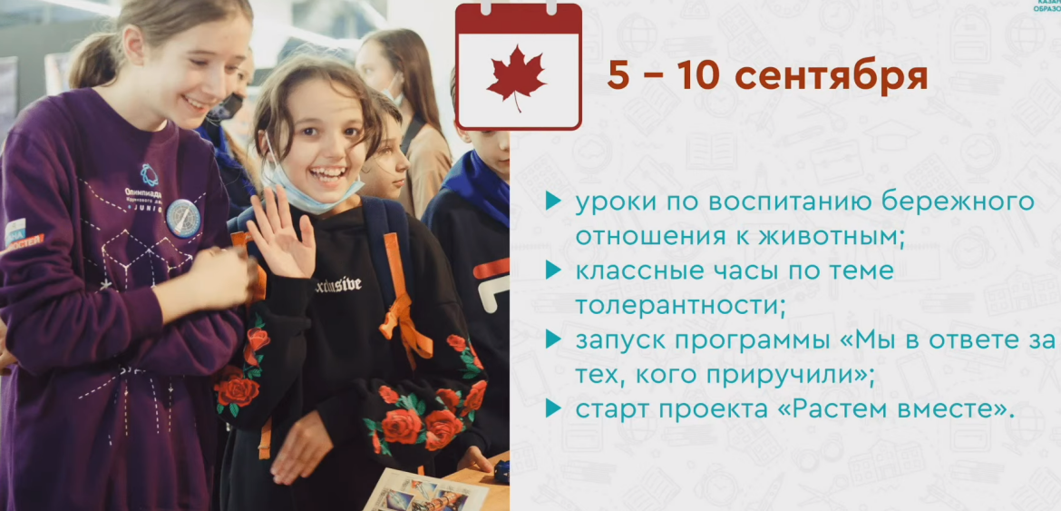 «В этом году неделя добра пройдет с 5-го по 10-е сентября. Запланировано проведение занятий по бережному отношению к животным, бесед с экспертами по социальной работе, проекта «Мы в ответе за тех, кого приучили», а также проекта «Растем вместе», - доложил Ризванов.