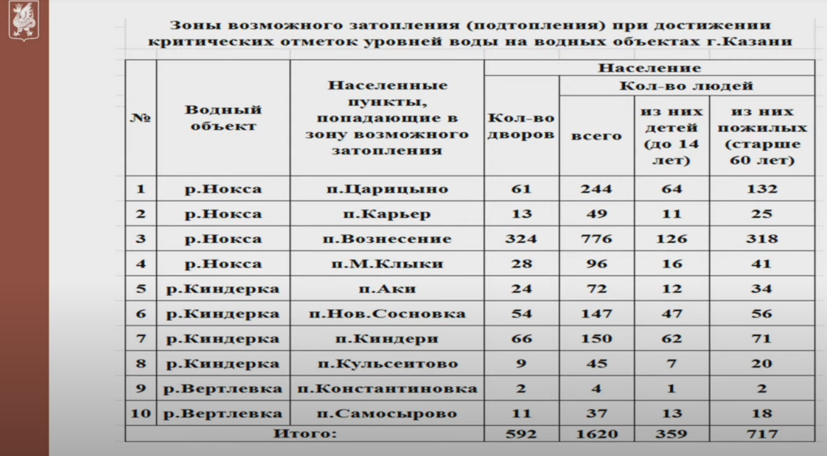 Опасные участки КазаниПри резком потеплении в Казани сложная паводковая ситуация наиболее вероятна в жилых массивах, через которые протекают малые реки – Казанка, Киндерка, Нокса и Сухая река. В вероятной зоне подтопления 592 дома, численность проживающих в которых превышает 1,6 тыс. человек. 359 из них – дети, а 717 – лица старше 60 лет.