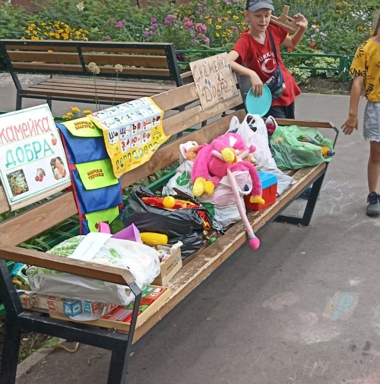 На скамейку положили на овощи, вещи в хорошем состоянии, игрушки. Сообщили об этом в групповом чате, который объединяет 130 человек. За короткое время все вещи были разобраны. Что пригодилось в хозяйстве, то и взяли соседи.