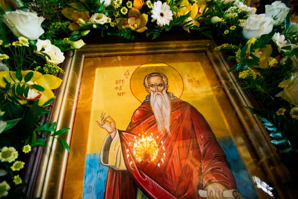Преподобный Феофан исповедникПреподобный Феофан исповедник, епископ Никейский, вместе с братом святым Феодором получили наименование «Начертáнных», потому что по приказу одного из императоров-иконоборцев на их лица раскалёнными иглами нанесли якобы позорящие их надписи — 12 стихотворных строк, в которых о исповедниках говорилось как об «сосудах суеверного заблуждения». Святой Феофан был одним из плодотворнейших гимнографов. Ему принадлежит множество песнопений на разные Господские и Богородичные праздники и памяти святых угодников. Лучшими творениями святого считаются канон в неделю Торжества Православия, каноны святым апостолам и канон Октоиха об усопших. Каноны святым апостолам преподобного Феофана исполнены высоких мыслей о звании учеников Христовых и вместе с тем говорят о бедственной участи грешной души человеческой.