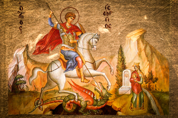 Великомученик Георгий ПобедоносецСвятой Георгий Победоносец пострадал в Никомидии в 303 году во время гонения на христиан императора Диоклетиана. Будучи тысяченачальником и любимцем Диоклетиана, Георгий обличил императора и объявил себя христианином, за что был брошен в темницу и с тяжёлым камнем на груди привязан к столбам. Святого подвергли пытке колесом, утыканным ножами и мечами, бросили в яму с негашёной известью, перебили кости на руках и ногах, заставили бежать в раскалённых железных сапогах, избили плетьми так, что со спины слезла кожа, принудили выпить две чаши с ядом, но ничто не повредило ему. После семи дней тяжких мучений святой Георгий явил чудеса: воскресил умершего, оживил павшего вола, сокрушил идолов в храме Аполлона, обратив многих ко Христу. На восьмой день мучений святого Георгия обезглавили.