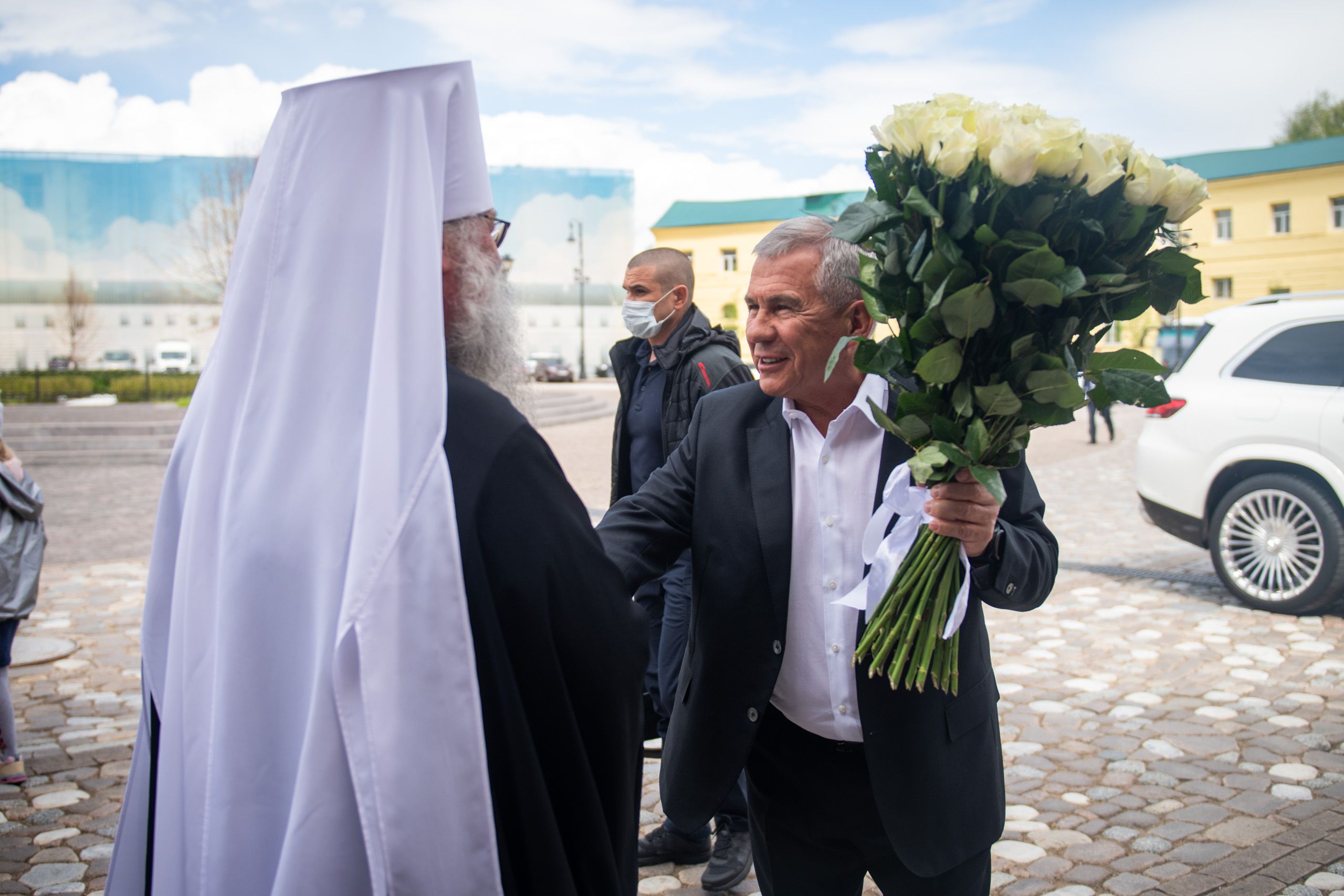 Президент Татарстана преподнёс главе митрополии букет цветов.