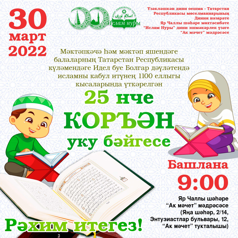 В дни весенних каникул, 30 марта, в Набережных Челнах в 25-й раз пройдет традиционный Республиканский детский конкурс чтецов Куръана. Организаторами конкурса являются ДУМ РТ, мухтасибат г.Наб.Челны, религиозно-предпринимательский центр «Ислам Нуры» и медресе «Ак мечеть». Соревнования приурочены к 1100-летию принятия ислама Волжской Булгарией.