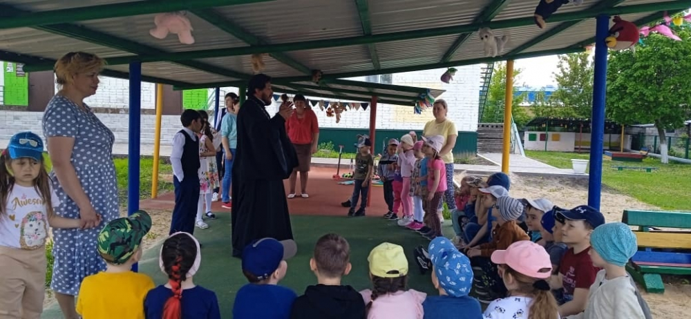 1 июня, в день Отдания Пасхи, и в Международный День защиты детей, настоятель храма Пророка Божия Илии г. Нурлата иерей Александр Кузьмин и матушка Ольга Кузьмина вместе с детьми посетили детский сад "Белочка".