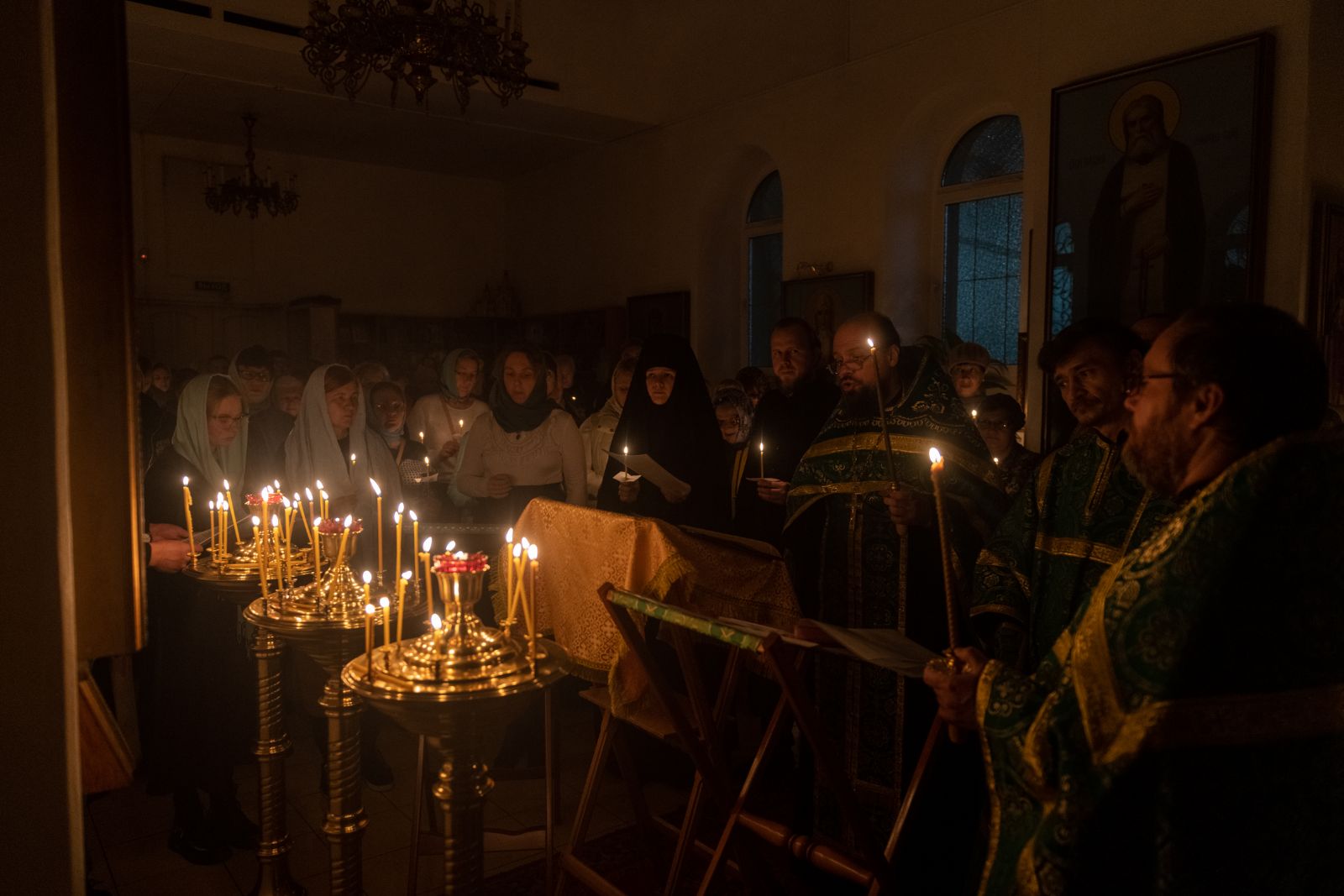 Служение ночной Божественной литургии предварялось общенародным пением акафиста преподобному Сергию Радонежскому, память которого Святая Церковь совершает 8 октября.
