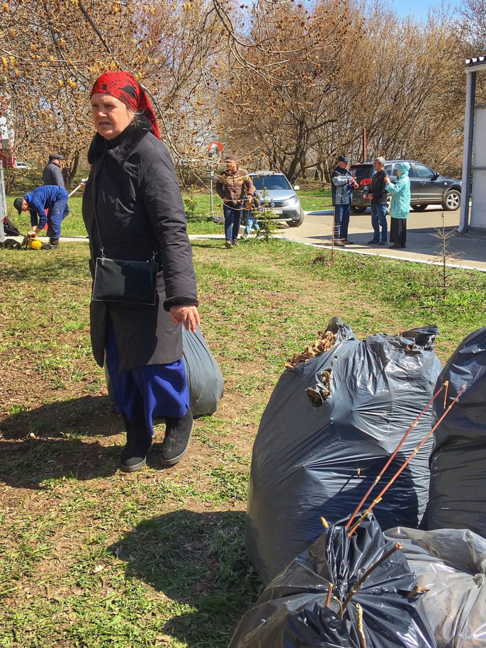 Участники субботника убирали скопившийся мусор, распиливали старые доски на дрова, после загружали мешки с мусором в грузовой фургон. Женщины и дети собирали граблями прошлогодние листья, сухую траву и мусор в большие кучи.