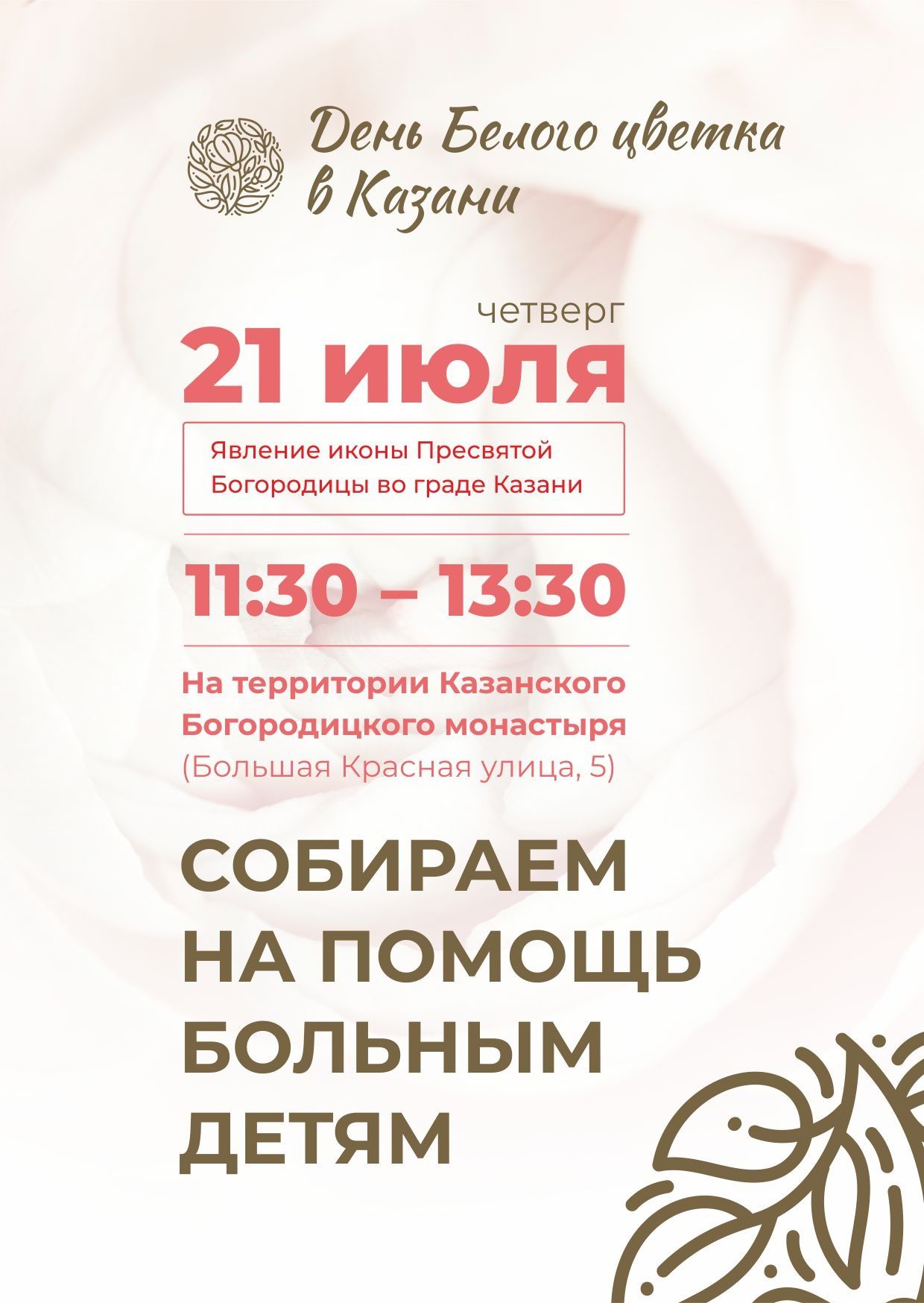 21 июля 2022 года, в праздник Казанской иконы Божией Матери, на территории Казанско-Богородицкого монастыря пройдет благотворительная акция «День белого цветка» в поддержку тяжелобольных детей. Акция проводится службой помощи нуждающимся «Милосердие – Казань» по благословению митрополита Казанского и Татарстанского Кирилла.