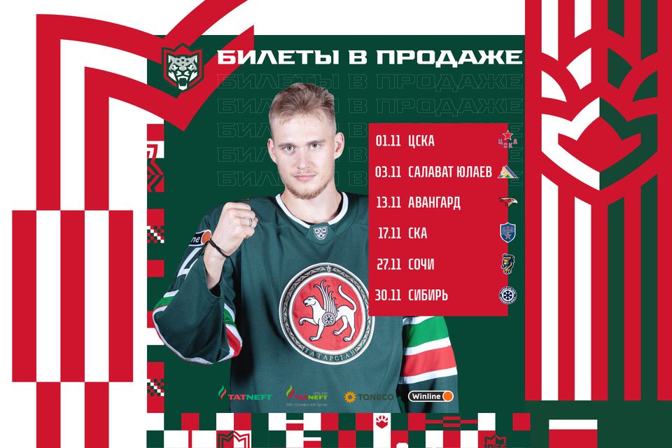 В ноябре «Ак Барс» примет на льду «Татнефть Арены» ЦСКА (1 ноября), «Салават Юлаев» (3 ноября), «Авангард» (13 ноября), СКА (17 ноября), «Сочи» (27 ноября) и «Сибирь» (30 ноября). Стоимость билетов на игры – от 250 до 1900 рублей в зависимости от выбранной категории.