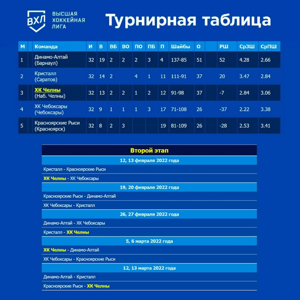 Пресс-служба хоккейного клуба «Челны» опубликовала электронный календарь второго этапа первенства. Так соперниками челнинцев во второй части соревнований станут ХК «Динамо-Алтай», «Кристалл» и «Чебоксары». Первая игры стартуют 12 и 13 февраля, челнинские хоккеисты должны будут принять на своем льду гостей из города Чебоксары. Место проведения матча клуб объявит позже.