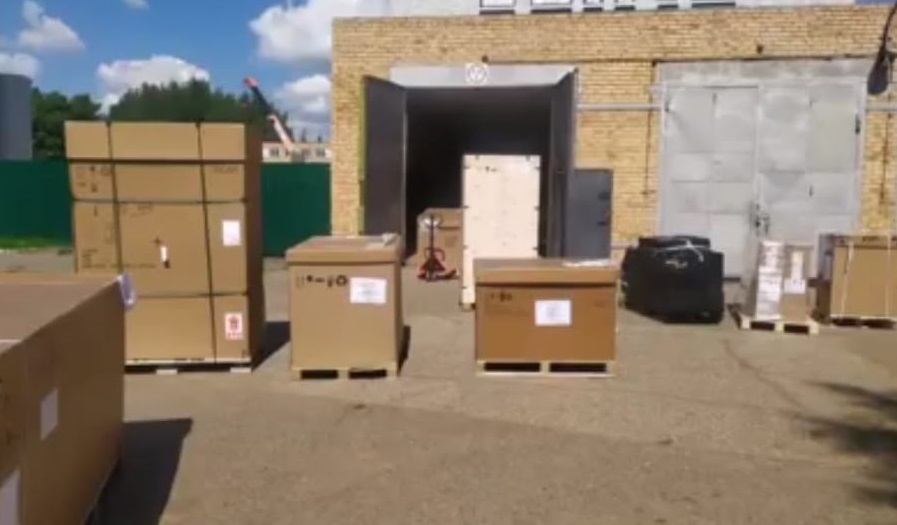 Оборудование весит почти две тонны, рабочие при помощи тяжёлой техники в общей сложности разгрузили 25 коробок.