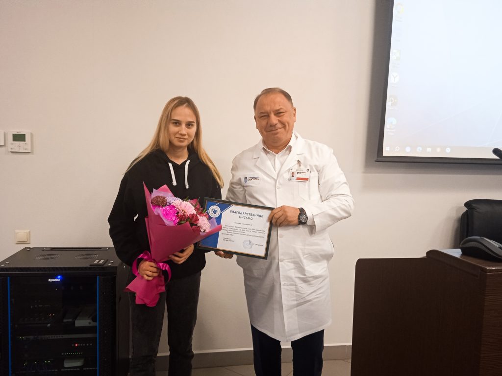 На утреннем совещании главный врач Университетской клиники КФУ Ринат Равилевич Шигабутдинов поздравил с завоеванным золотом на Спартакиаде медиков медсестру отделения анестезиологии и реанимации №3 Азалию Азатовну Хабибуллину.