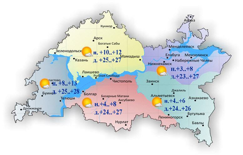 Температура воздуха по Татарстану в темное время суток составит от +3 до +8 градусов (на западе региона — до +13, в Казани — от +10 до +12). При этом прохладнее всего в ночные часы будут на востоке. В дневные часы воздух прогреется до 23–28 градусов тепла (в столице республики — до +25, +27).