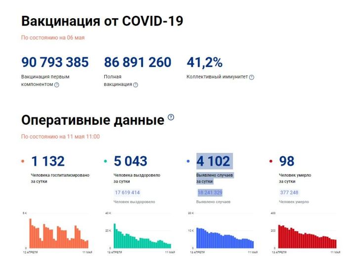По данным сайта , на 11.00 11 мая 2022 года, в России всего выявлено 18 241 329 случаев заражения COVID-19, в том числе 4 102 за сутки.
